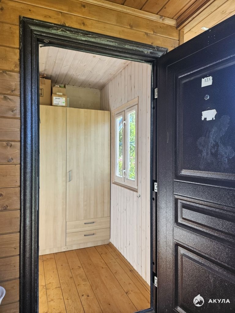 Дом деревянный, материал стен вагонка, фундамент свайный точечный, кровля металлическая профиллированная, общая площадь составляет 32 кв.м.
