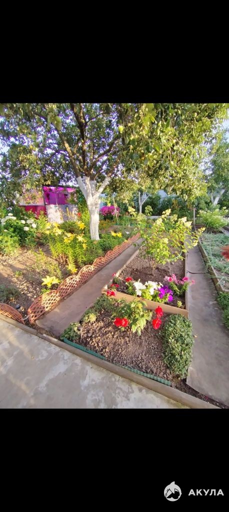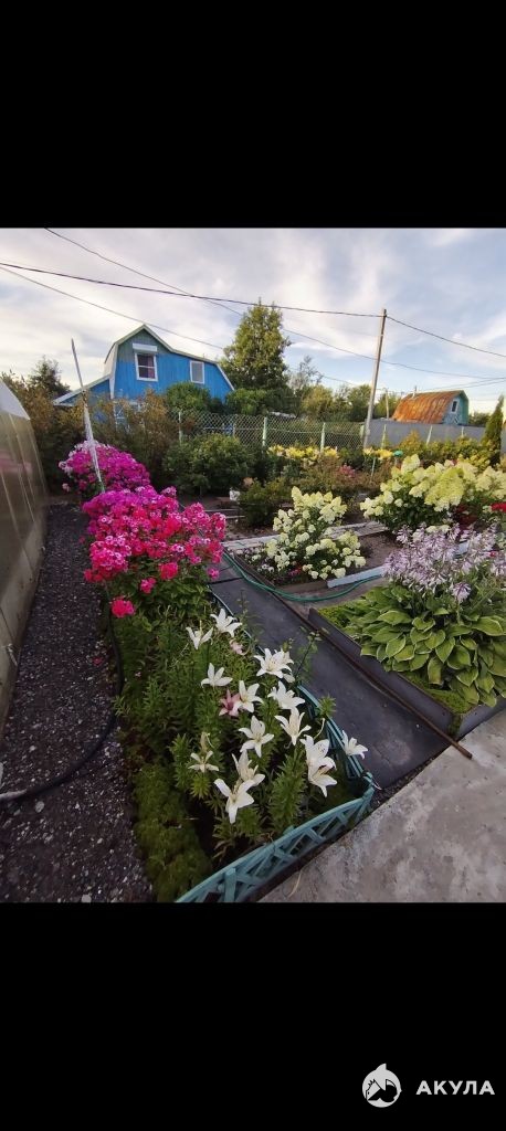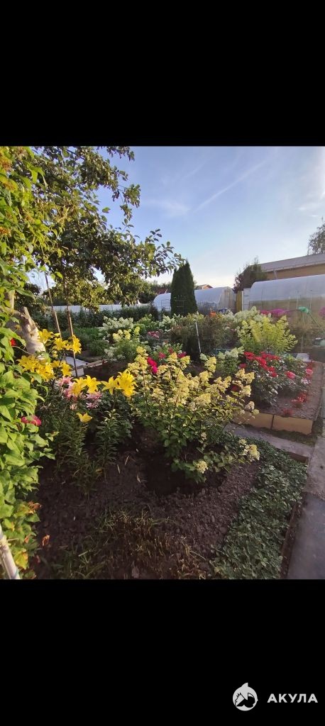 На участке две теплицы, плодовые деревья, грядки под овощи и очень много цветов.