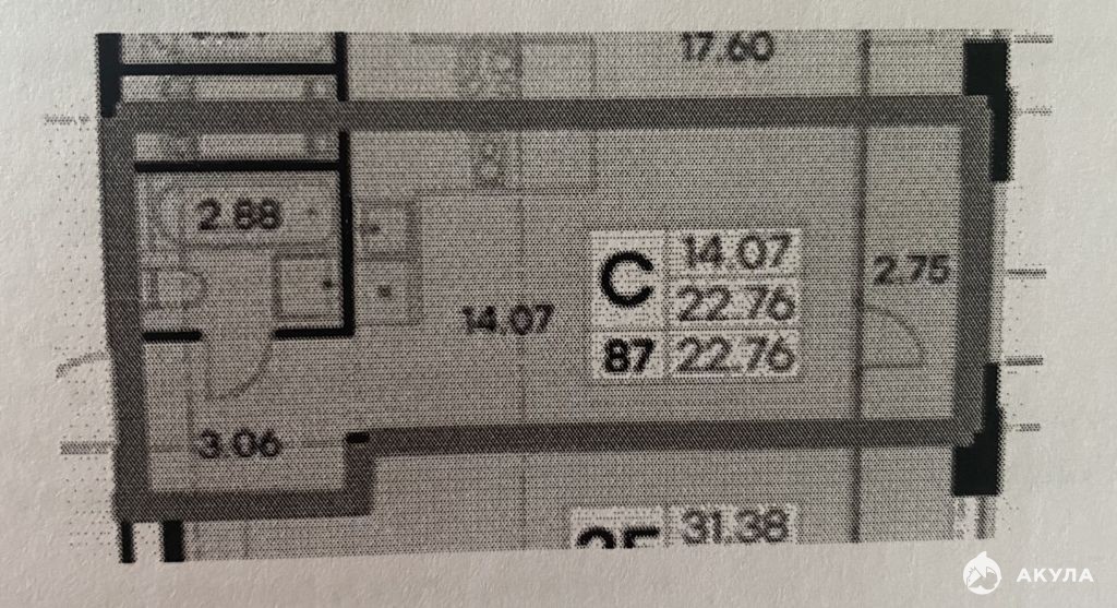 - Общая площадь: 22, 76 м.