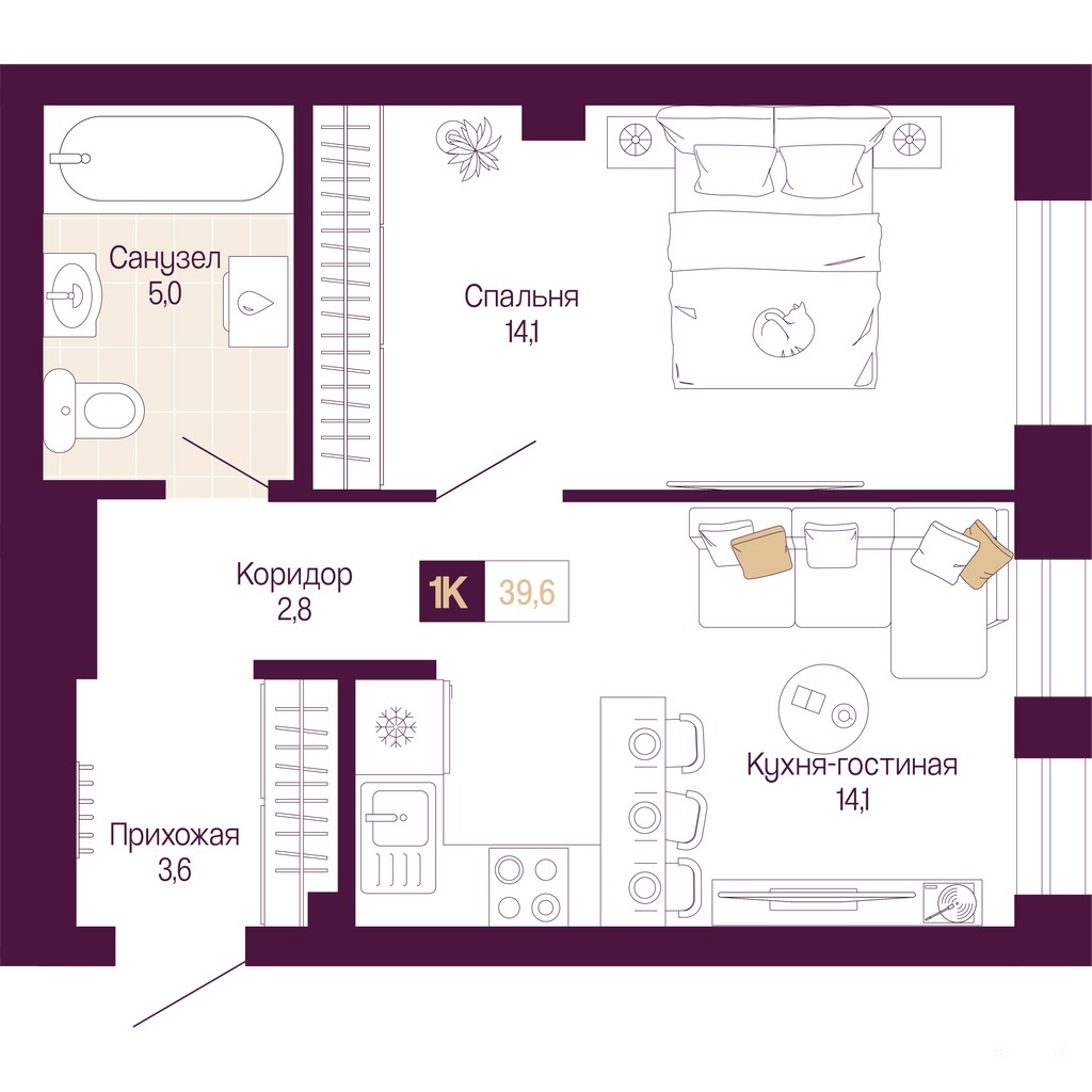 Просторная однокомнатная квартира с предчистовой отделкой в ЖК "ИДЕЛЬ. Квартал на Сенной" на 2 этаже. Общая площадь: 39.6 кв.м., жилая: 14.1 кв.м., площадь просторной кухни-столовой: 14.1 кв.м. Все окна выходят на одну сторону. В квартире один совмещенный санузел. Высота потолков 3.0 м.