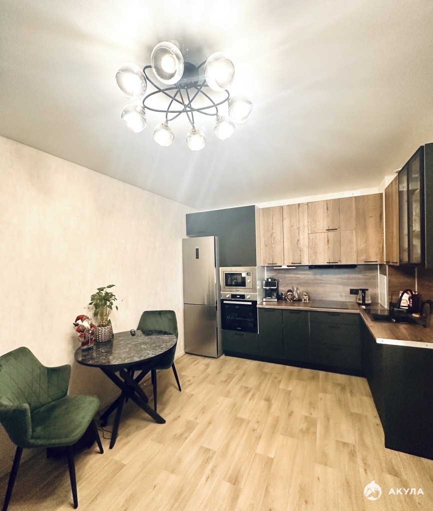 Просторная кухня-гостиная площадью 18.6м² оснащена современной бытовой техникой, включая холодильник и посудомоечную машину.