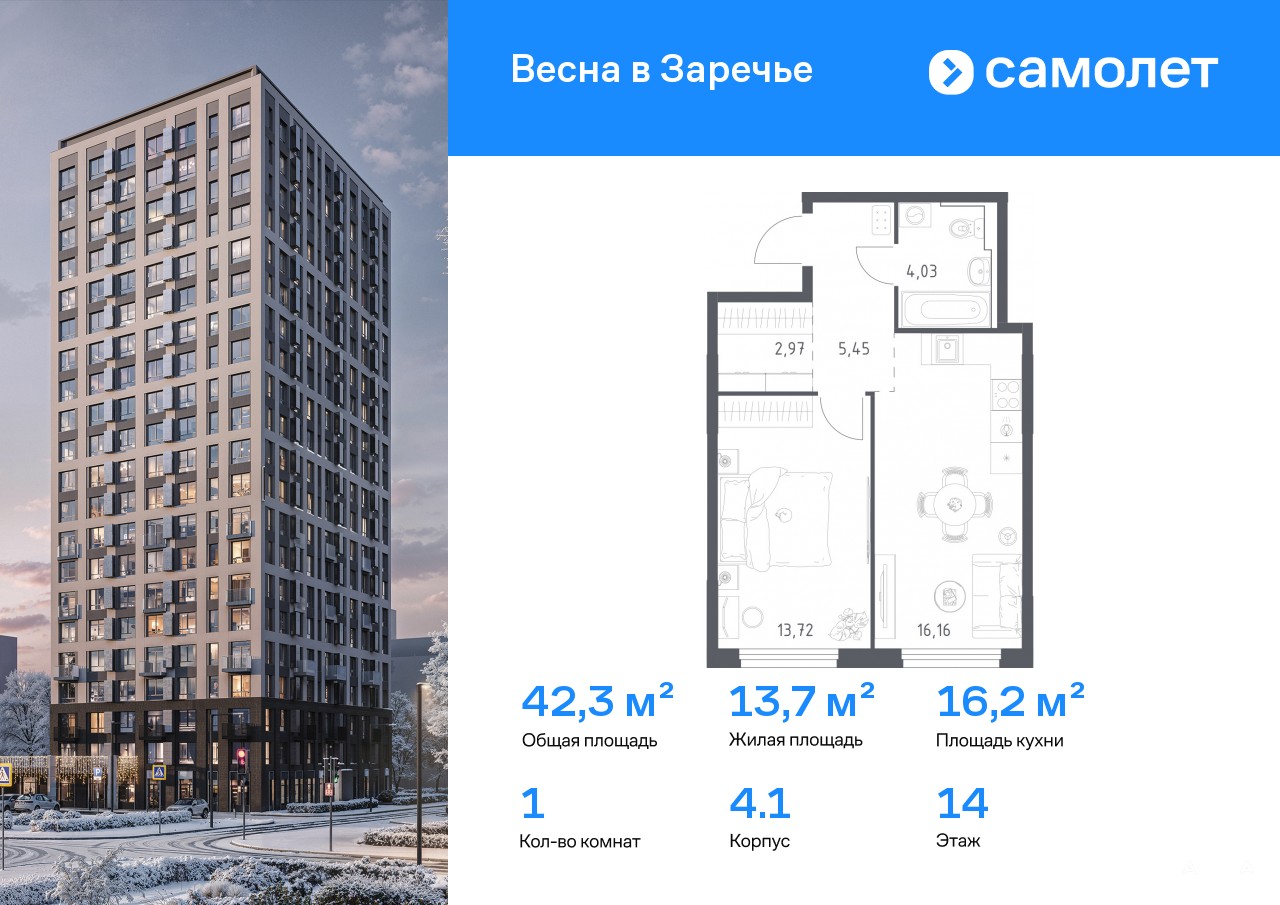 Строим кварталы для жизни с заботой о будущем. Предлагается 1-комнатная квартира комфорт-класса 42, 33 кв.м в корпусе 4.1 на 14 этаже, в ЖК «Весна в Заречье»
