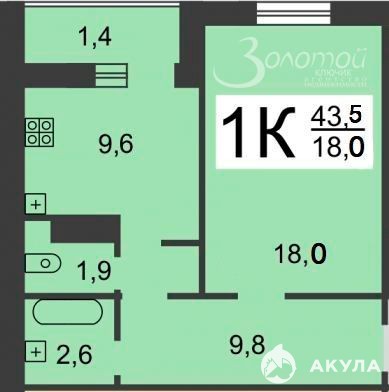 Общая площадь 43, 5 кв.м. (с учетом лоджии)
