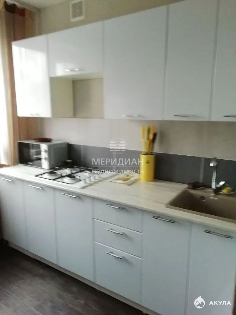 На кухне остается кухонный гарнитур.