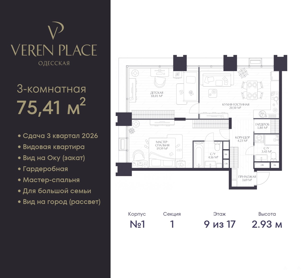 Двухкомнатная квартира в ЖК "VEREN PLACE Одесская" на 9 этаже. Квартира без отделки, новый собственник может сделать ремонт по своему проекту. Общая площадь: 75.41 кв.м., жилая: 37.6 кв.м., площадь просторной куxни-гостиной: 20.5 кв.м. Квартира угловая, окна oбecпeчивaют paвнoмepнoe ocвeщeниe в тeчeниe дня. В квартире два совмещенных санузла. Высота потолков 2.93 м.