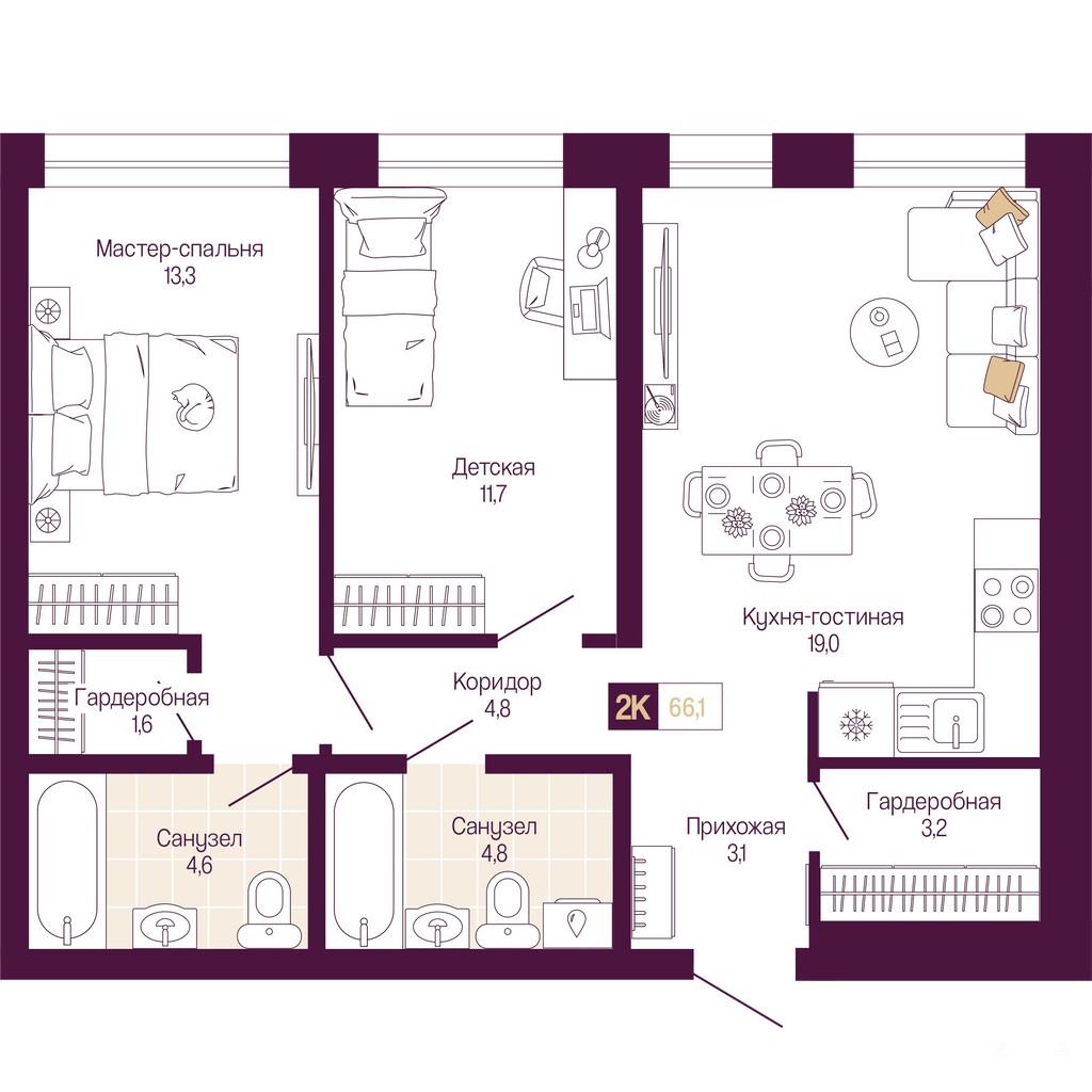 Двухкомнатная квартира от застройщика с предчистовой отделкой в ЖК "ИДЕЛЬ. Квартал на Сенной" на 11 этаже. Общая площадь: 66.1 кв.м., жилая: 25 кв.м., площадь просторной кухни-столовой: 19 кв.м. Комнаты изолированные, все окна выходят на одну сторону. В квартире два совмещенных санузла. Высота потолков 3.0 м.