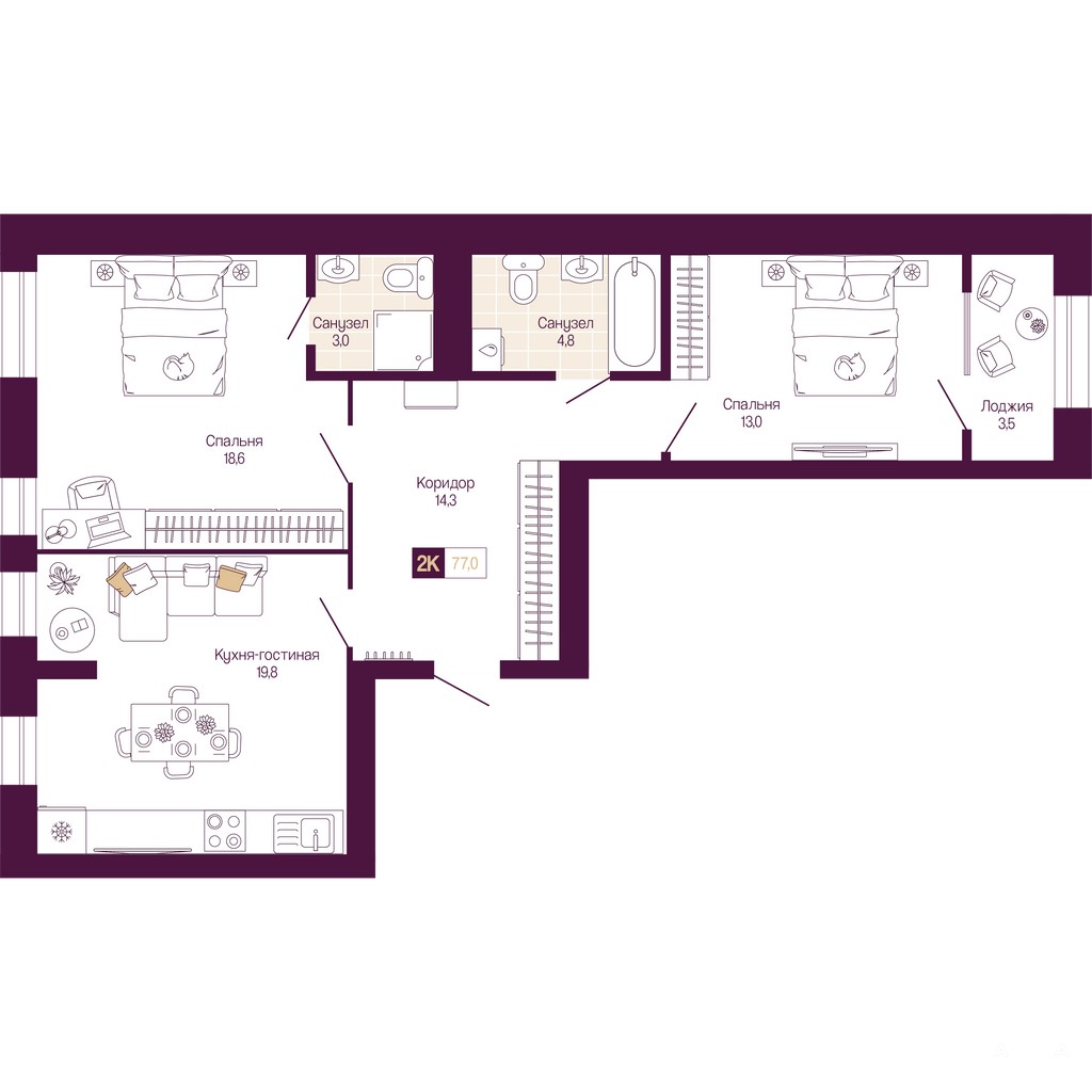 Двухкомнатная квартира с предчистовой отделкой в ЖК "ИДЕЛЬ. Квартал на Сенной" на 2 этаже. Общая площадь: 75.3 кв.м., жилая: 31.6 кв.м., площадь просторной кухни-столовой: 19.8 кв.м. Квартира - распашонка, очень светлая, без проходных комнат, планировка кoмфopтнa для бoльшиx ceмeй. В квартире один балкон, два совмещенных санузла. Высота потолков 3.0 м.