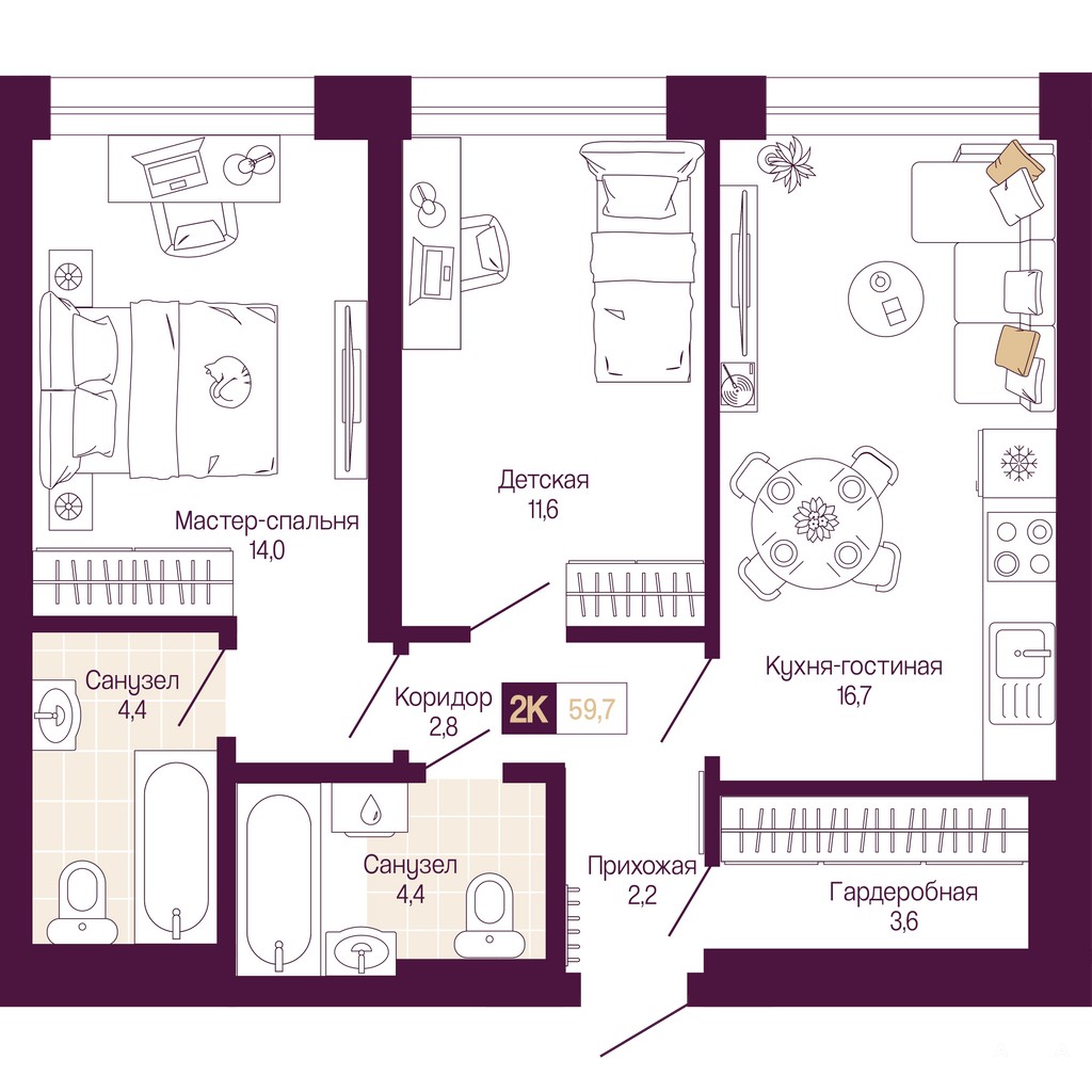 2-комн. квартира с предчистовой отделкой в ЖК "Идель. Квартал на Сенной" на 19 этаже. Общая площадь: 59.7 кв.м., жилая: 25.6 кв.м., площадь просторной кухни-столовой: 16.7 кв.м. Комнаты изолированные, все окна выходят на одну сторону. В квартире два совмещенных санузла. Высота потолков 2.8 м.