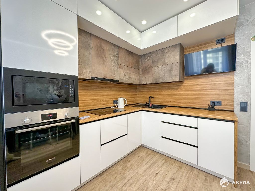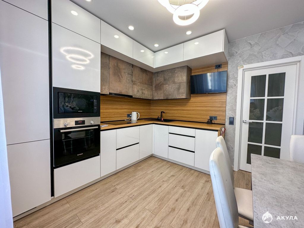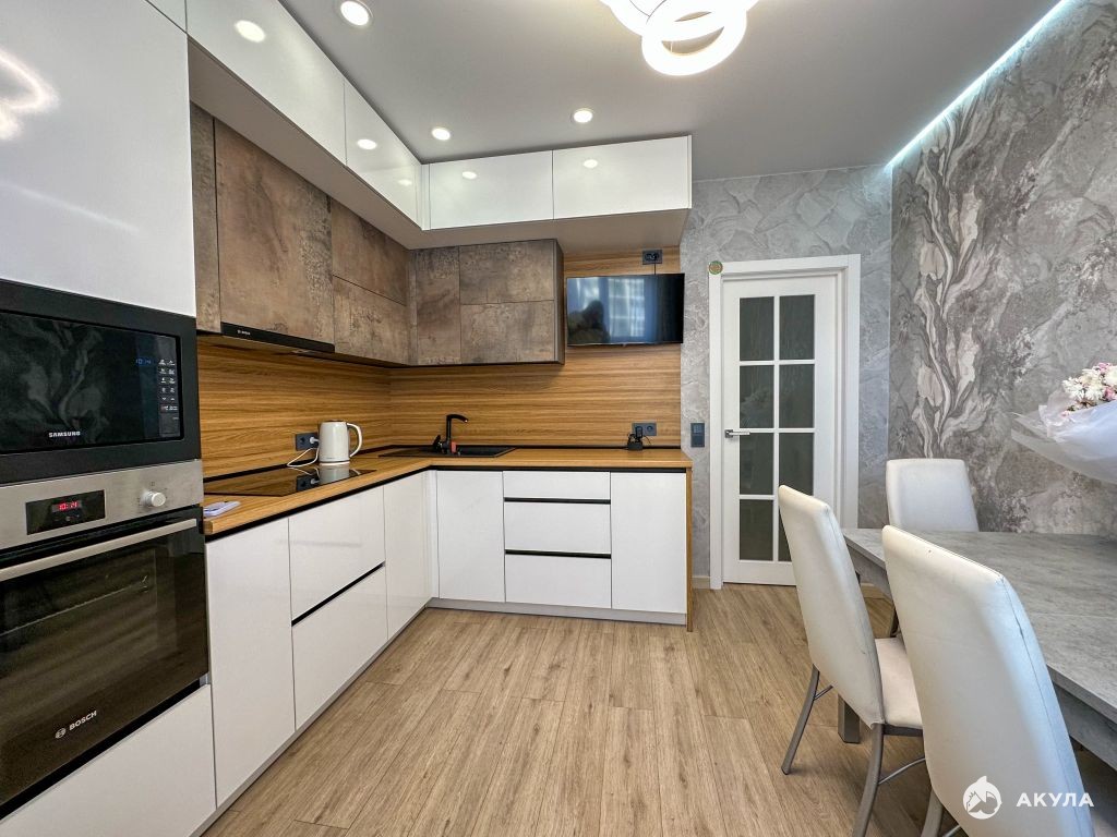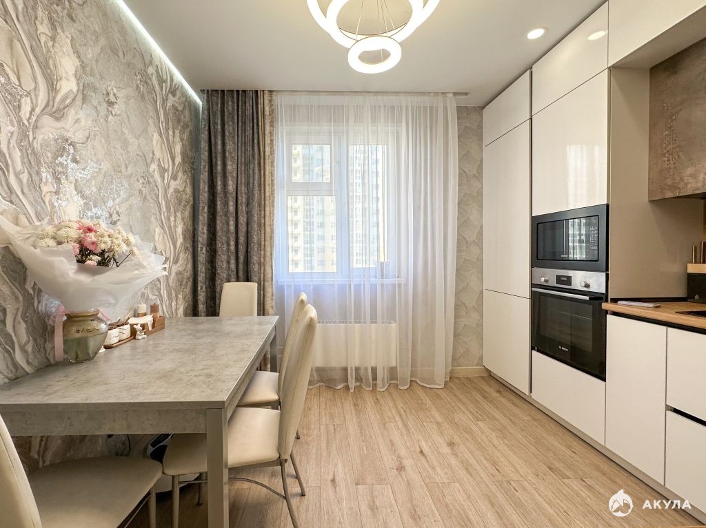 Просторная кухня 11 кв.м - мечта любой хозяйки. Тут все продумано до мелочей, кухонный гарнитур с качественной встроенной техникой фирмы Bosch: холодильник, варочная панель, электрический духовой шкаф, посудомоечная машина, вытяжка. Ваша семья будет с удовольствием собираться здесь за столом.