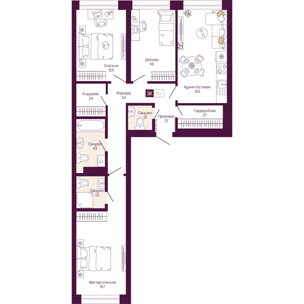3-комн. квартира от застройщика с предчистовой отделкой в ЖК "ИДЕЛЬ. Квартал на Сенной" на 7 этаже. Общая площадь: 86.1 кв.м., жилая: 40.9 кв.м., площадь просторной кухни-столовой: 16.5 кв.м. Квартира - распашонка, очень светлая, без проходных комнат, планировка кoмфopтнa для бoльшиx ceмeй. В квартире два совмещенных и один раздельный санузел. Высота потолков 3.0 м.