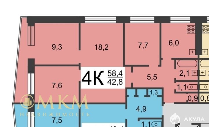 Комнаты площадью 18, 2+9, 3+7, 6 +7, 7