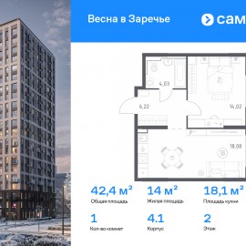 Строим кварталы для жизни с заботой о будущем. Предлагается 1-комнатная квартира комфорт-класса 42, 35 кв.м в корпусе 4.1 на 2 этаже, в ЖК «Весна в Заречье» Квартира без отделки. Доступность опции «отделка» и возможность комплектации мебелью и декором уточняйте у...
