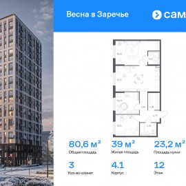Строим кварталы для жизни с заботой о будущем. Предлагается 3-комнатная квартира комфорт-класса 80, 6 кв.м в корпусе 4.1 на 12 этаже, в ЖК «Весна в Заречье» Квартира без отделки. Доступность опции «отделка» и возможность комплектации мебелью и декором уточняйте у...
