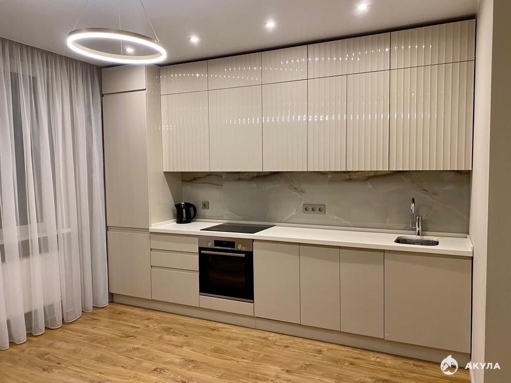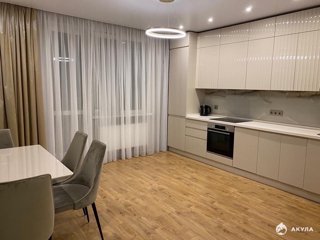 Светлая кухня-гостиная с современным кухонным гарнитуром. В кухонном гарнитуре установлена вся необходимая техника: встроенный холодильник, плита и духовой шкаф Bosch, вытяжка, посудомоечная машина, стиральная машина. В гостиной установлен кондиционер.