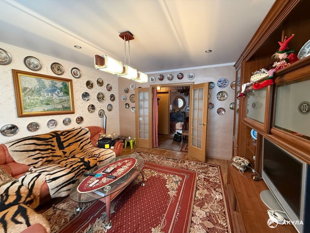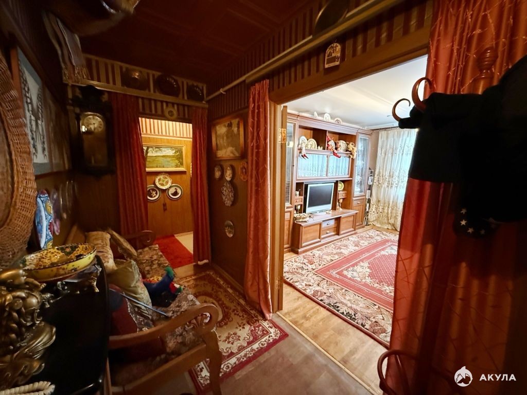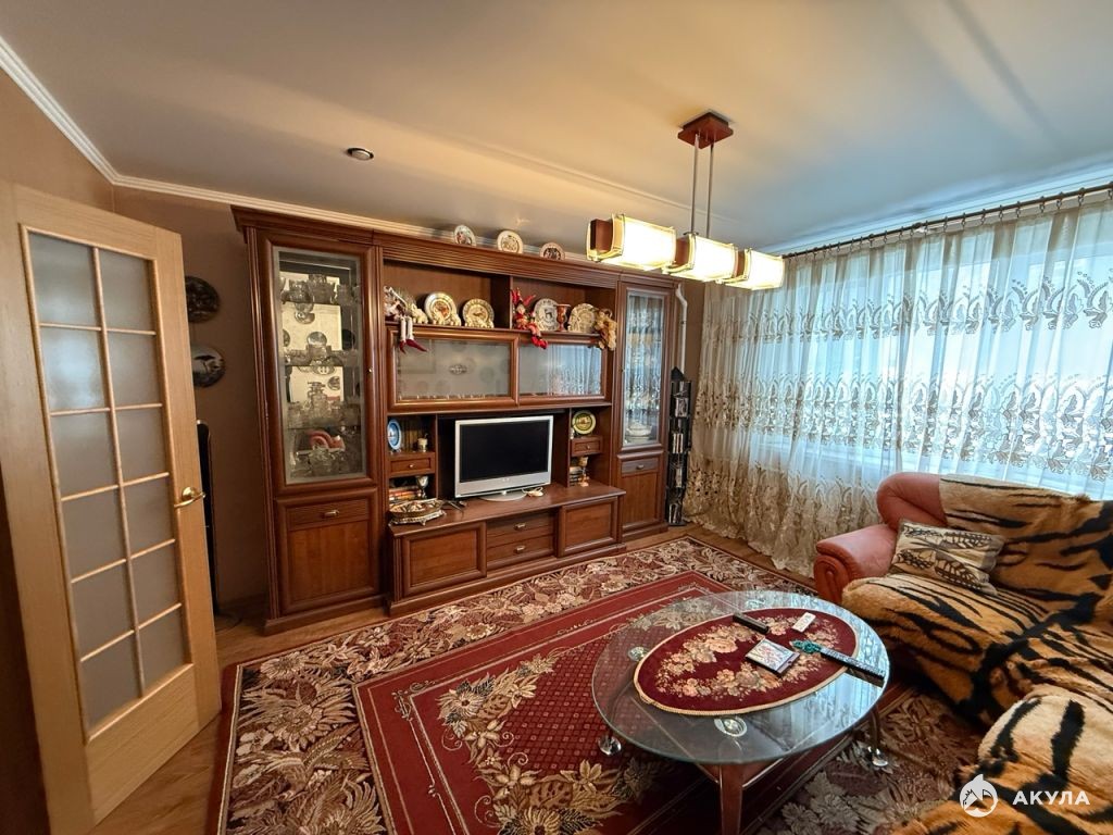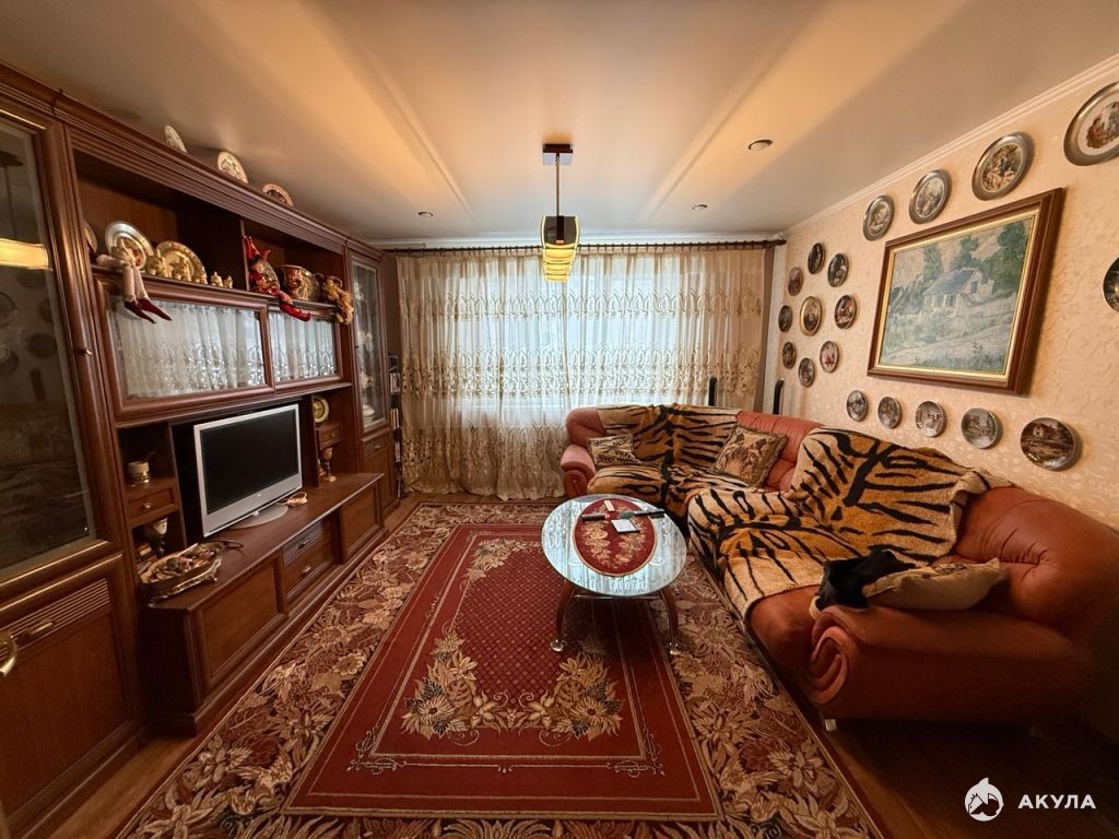 Лоджия зacтeклена, обустроена, есть погреб. Пластикoвыe окнa. Стeны выpовнeны, поклеены. Санузел -плитка. Входная дверь: хорошая толстая металлическая. Полы: паркетная доска. Потолки: натяжные. Межкомнатные двери (натуральный шпон).